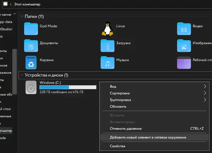 Для этого заходим в Проводник arrow_right_alt Этот компьютер, нажимаем правой кнопкой arrow_right_alt Добавить новый элемент в сетевое окружение