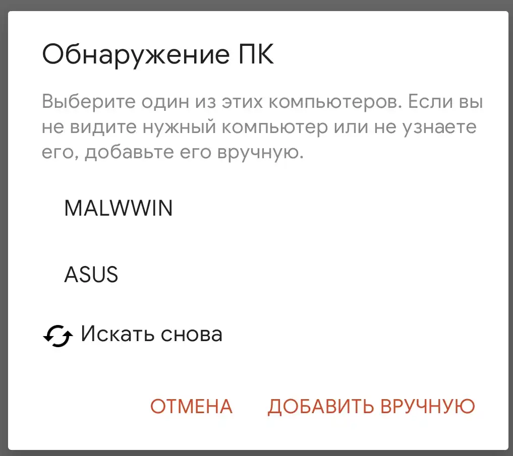 Нажимаем + в правом верхнем углу arrow_right_alt Добавить компьютер. И нам сразу же показываются ПК в сети: