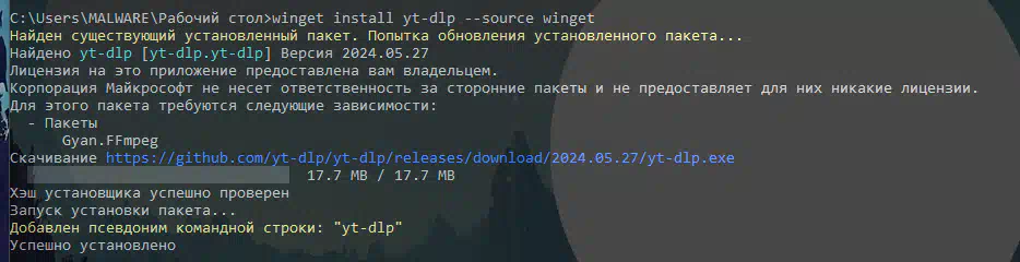 $progressPreference = 'silentlyContinue'; Install-PackageProvider -Name NuGet -Force; Install-Module -Name Microsoft.WinGet.Client -Force -Repository PSGallery; Repair-WinGetPackageManager; PauseПосле этого winget будет установлен, открываем новую командную строку и снова выполняем установку yt-dlp:inget install yt-dlp --source winget