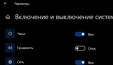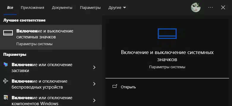 Теперь убираем системный значок громкости. В поиске пишем «Включение и выключение системных значков»: