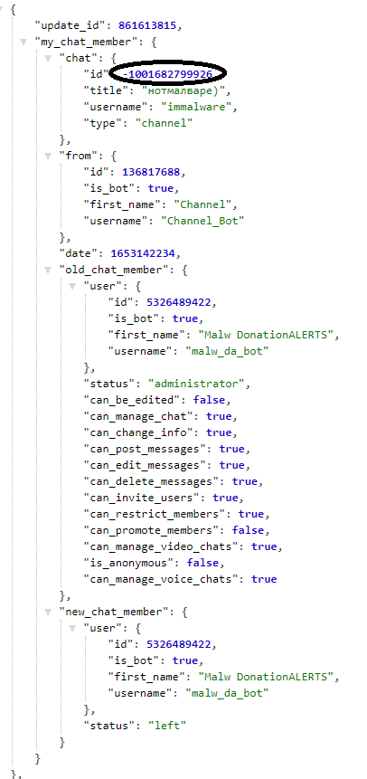 https://api.telegram.org/bot{token}/getUpdates, подставляем туда токен бота вместо{token}, переходим по ней. - Добавляем бота в канал или пишем ему любое сообщение, обновляем страницу и видим там ID пользователя, написавшего сообщение или ID канала, куда бот был приглашен. Тут ID пользователя: