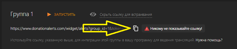- Получаем токен оповещений DonationAlerts. Для этого заходим в настройки виджета, возле "Группа 1" нажимаем "Показать ссылку для встраивания" и копируем ее.