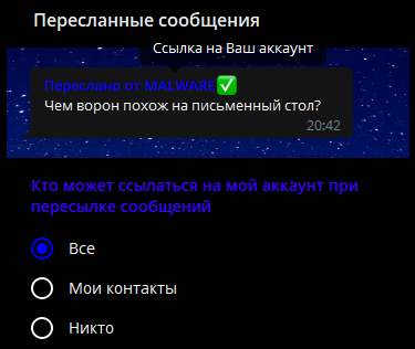 # api.messages.send(peer_id=message['peer_id'], message='Проверка успешна!', random_id=0, forward=json.dumps({'peer_id': message['peer_id'], 'conversation_message_ids': message['conversation_message_id'], 'is_reply': 1}))